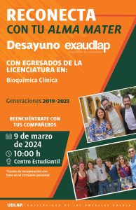 10:00 am-11:00 am 09/03/2024  La Dirección de Vinculación con Egresados te invita al Desayuno con egresados de Lic. en Bioquímica Clínica Los datos de carácter personal que usted proporcione a través del presente acto, serán utilizados únicamente para llevar a cabo su registro para la visita mencionada, así como para efectos de convocatorias similares a la cual se ha inscrito. La Fundación Universidad de las Américas, Puebla (UDLAP) tratará los datos personales en apego a su Aviso de Privacidad ( www.udlap.mx/privacidad/), así como en lo establecido en la Ley Federal de Protección de Datos Personales en Posesión de los Particulares y su Reglamento.